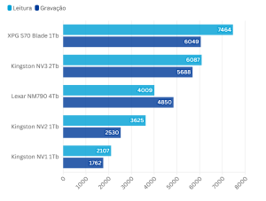 Contudo, esses valores mudam conforme a capacidade. Por exemplo, o NV2 de 500 GB tem leitura de 3.500 MB/s e gravação de 2.100 MB/s, enquanto o Kingston NV3 aumenta esses valores para 5.000 MB/s de leitura e 3.000 MB/s de gravação.